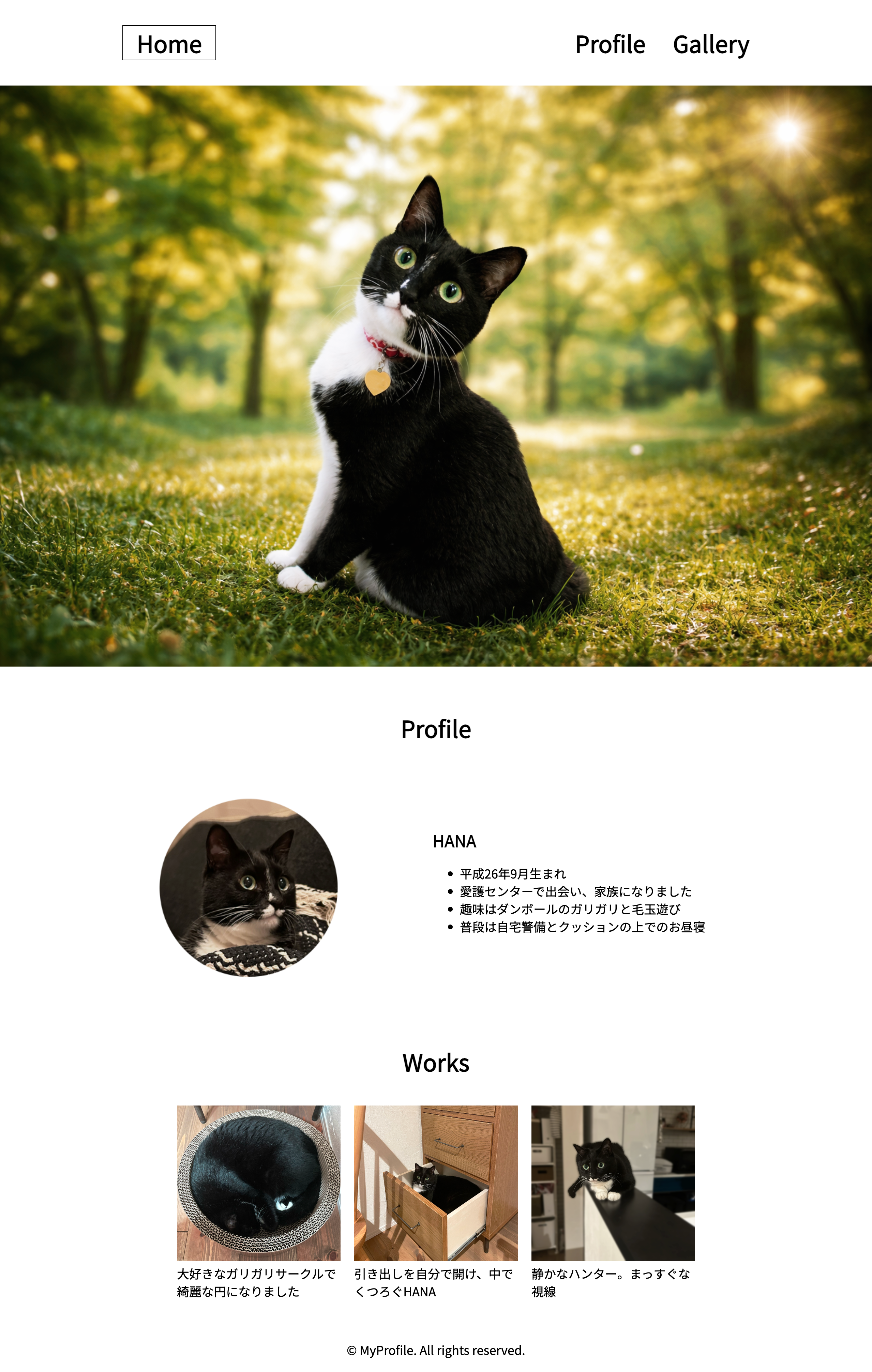 スクロールなしですぐに情報が読み取れるよう、1枚のページに情報をまとめております。 愛猫「はな」の魅力を最大限に表現するためのビジュアル重視サイトとして制作しました。 写真を主役に、世界観を伝える構成を意識しています。